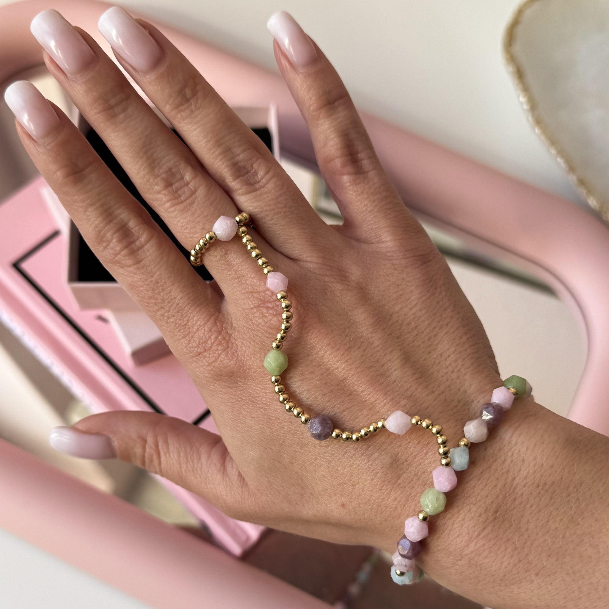 Przepi臋kna bransoletka po艂膮czona z pier艣cionkiem, wykonana z kamieni naturalnych - jadeit turmalinowy o pi臋knej pastelowej barwie.