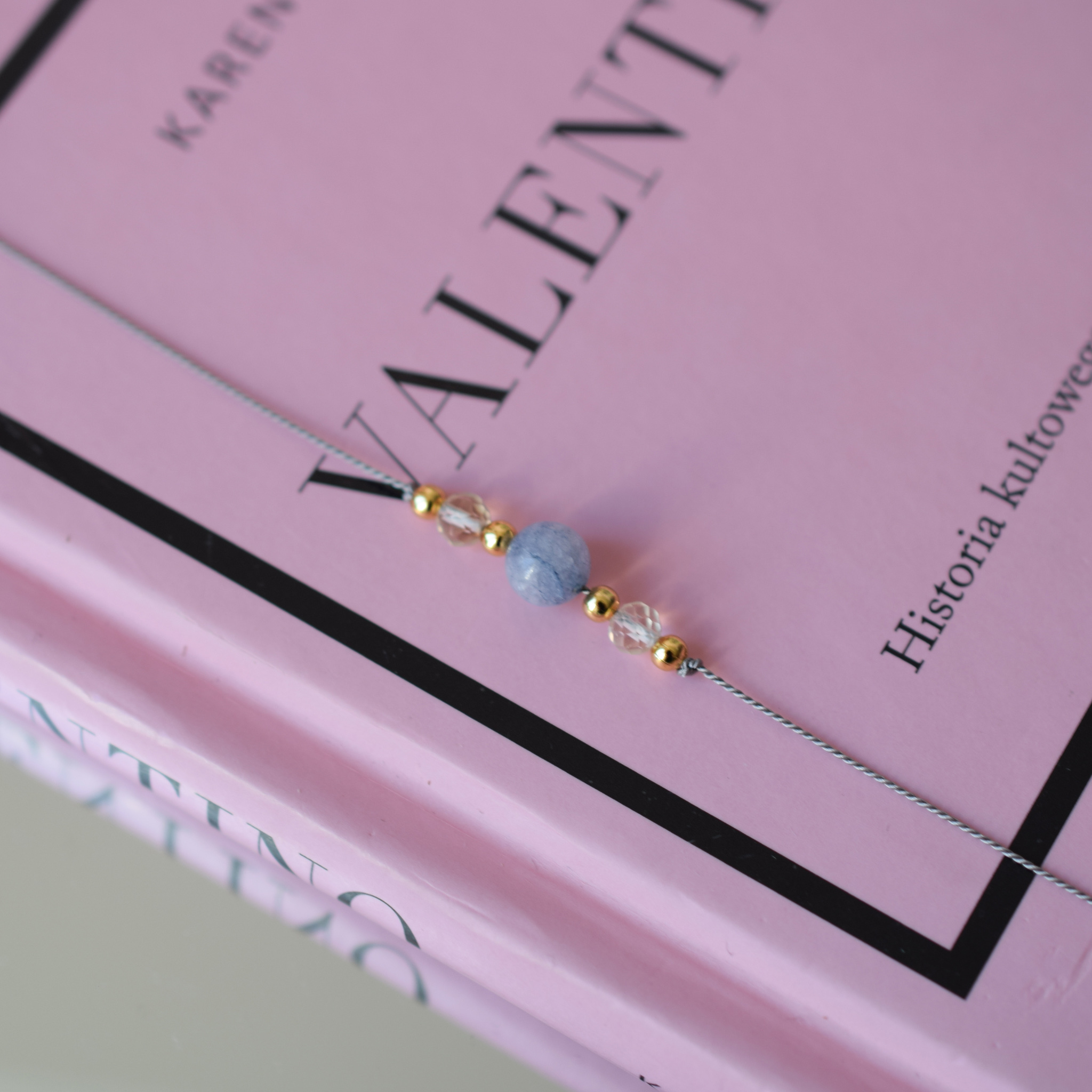 Wykonana na jedwabnej nici jubilerskiej, zdobiona naturalnymi kamieniami: agat koronkowy niebieski oraz cytryn tak偶e stal szlachetna poz艂acana.