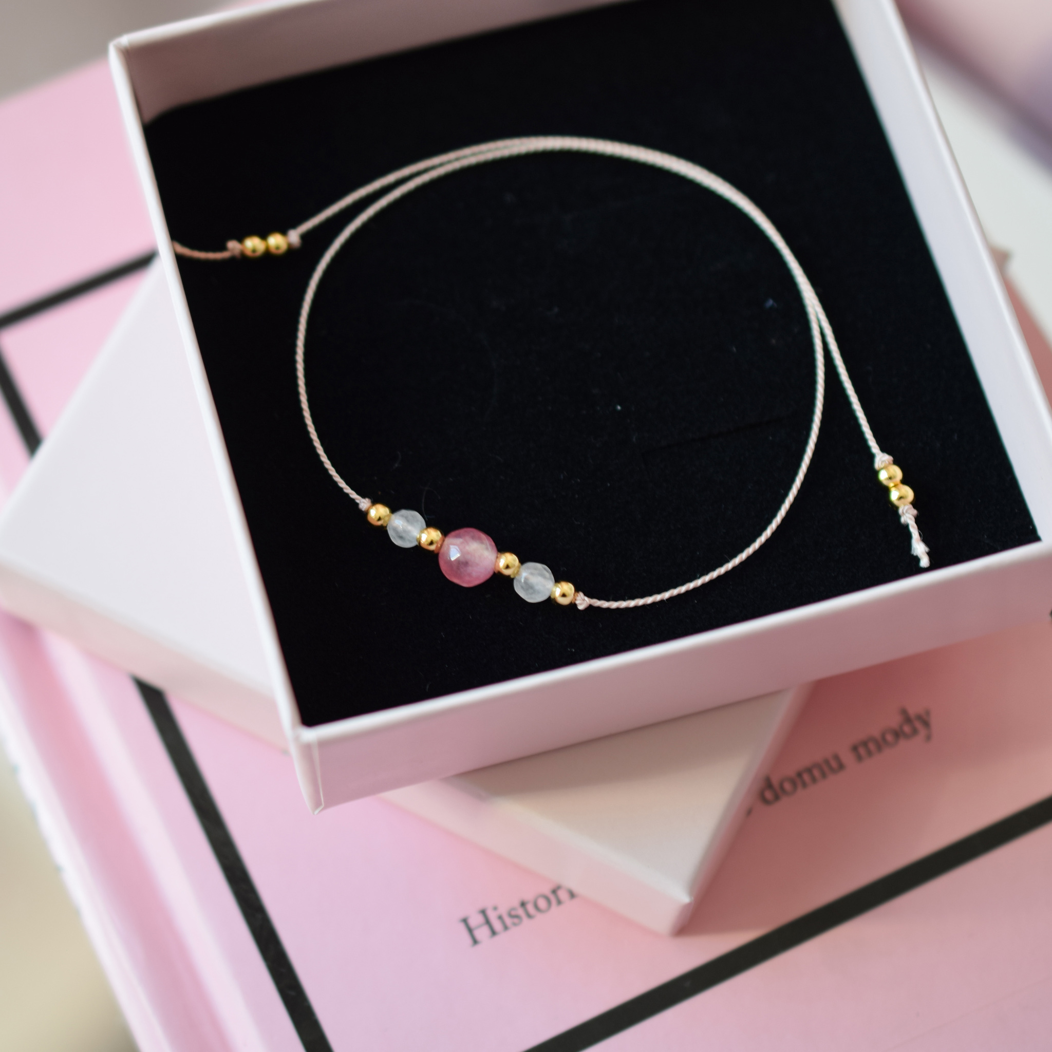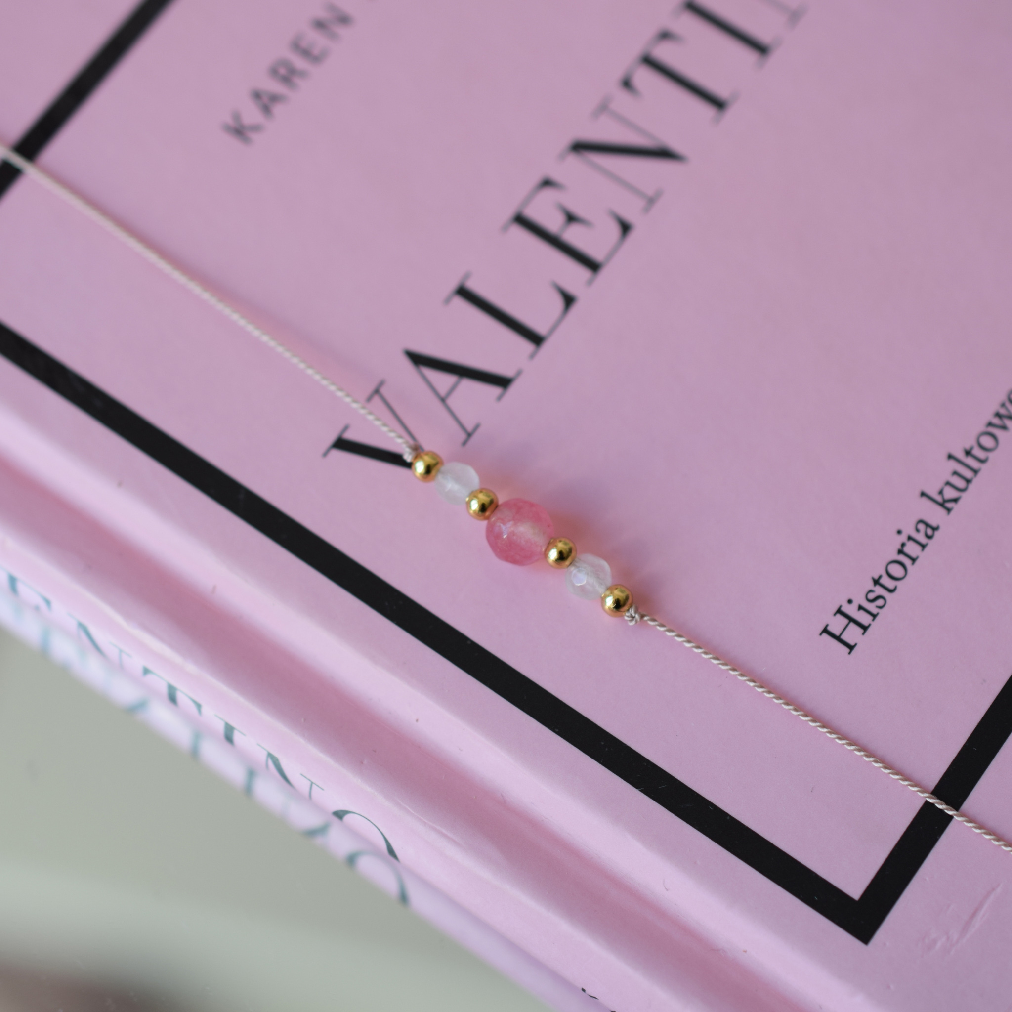 Wykonana na jubilerskiej nici jedwabnej, zdobiona kamieniami naturalnymi takimi jak kwarc r贸偶owy oraz kamie艅 ksi臋偶ycowy.