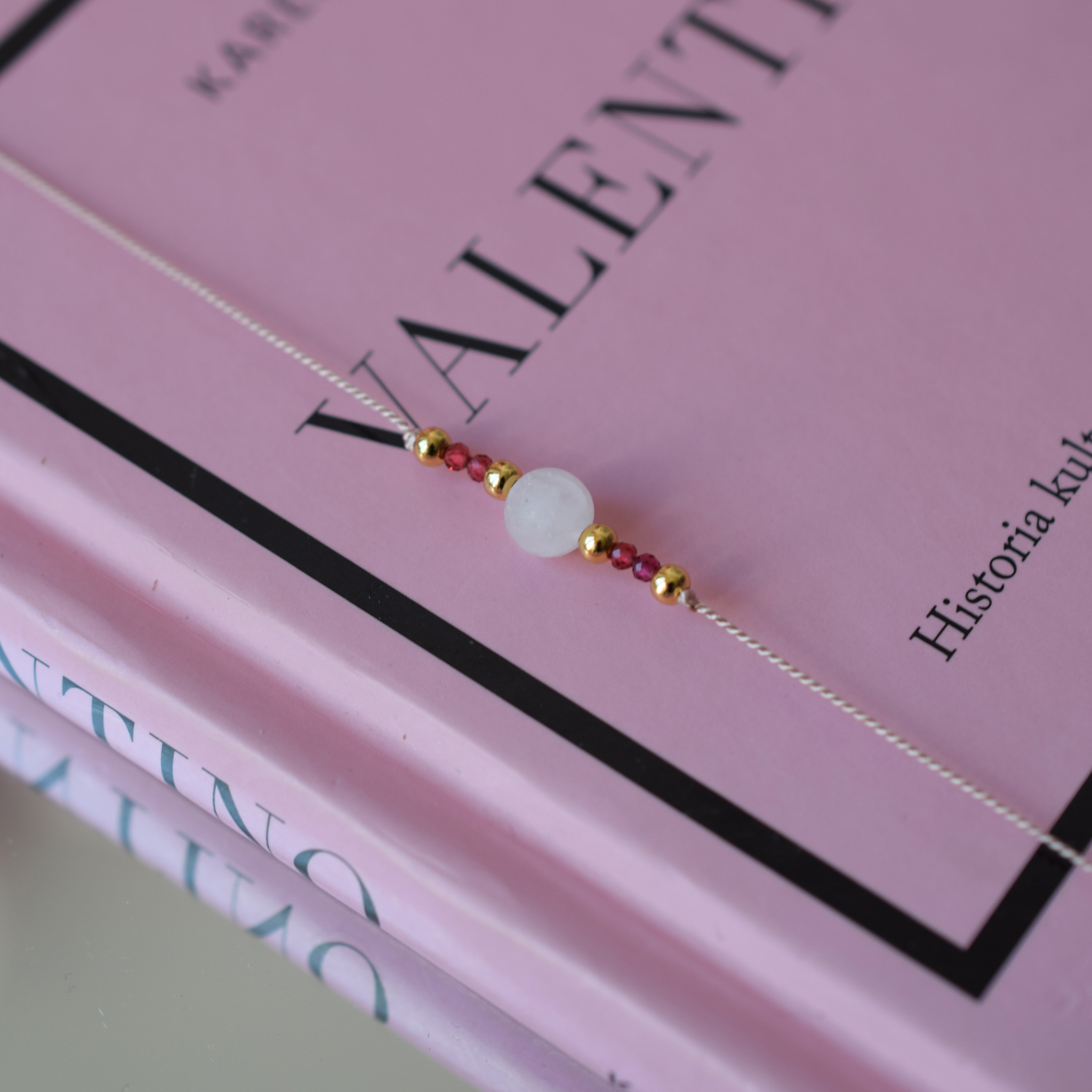 Wykonana na jedwabnej nici jubilerskiej, zdobiona naturalnymi kamieniami takimi jak: kamie艅 ksi臋偶ycowy oraz rubin a tak偶e stal szlachetna poz艂acana.