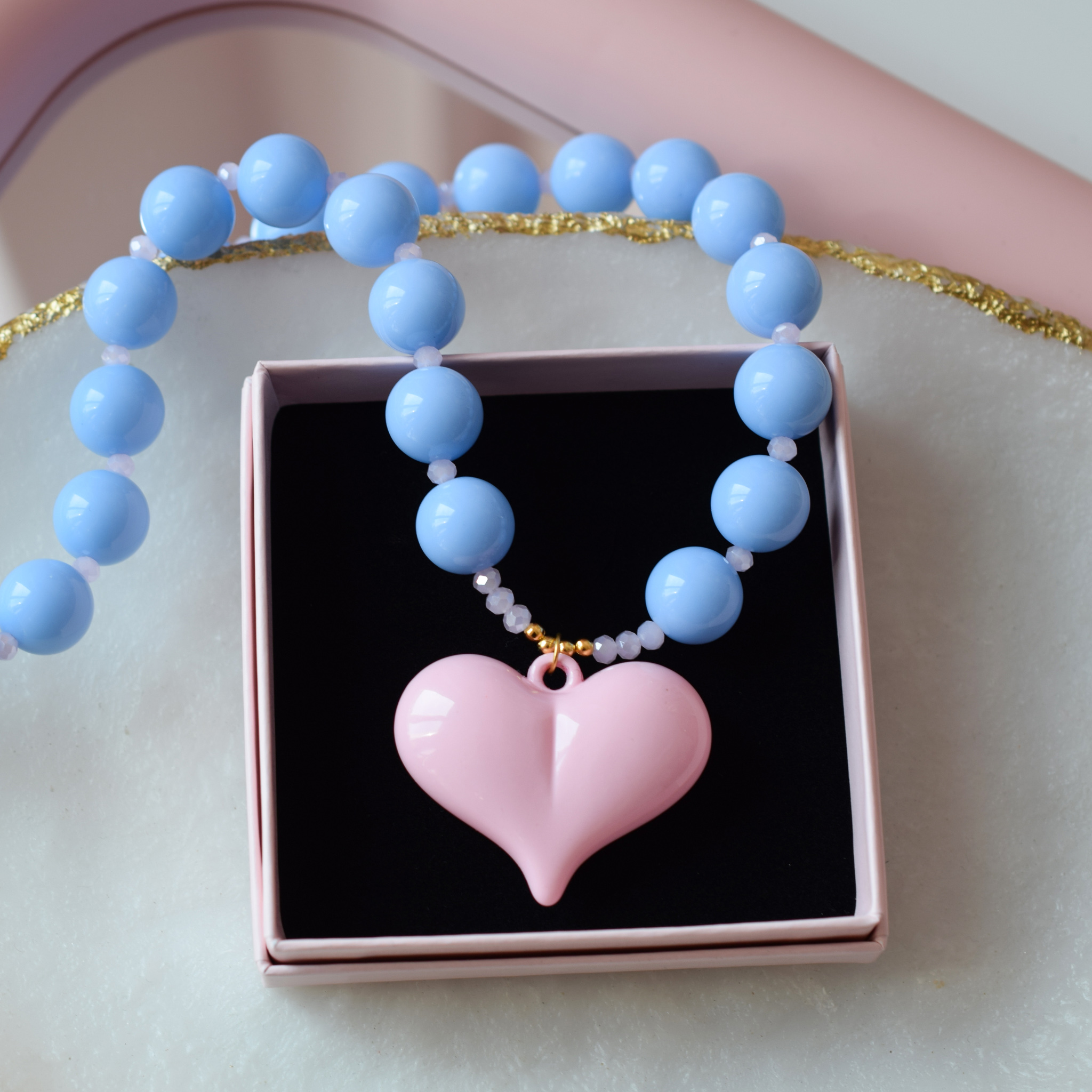 Wykonany z najwy偶szej jako艣ci kryszta艂贸w w kolorze pudrowego r贸偶u, z艂otych kulek ze stali szlachetnej, poz艂acanej oraz du偶ych聽niebieich kul z akrylu jubilerskiego.