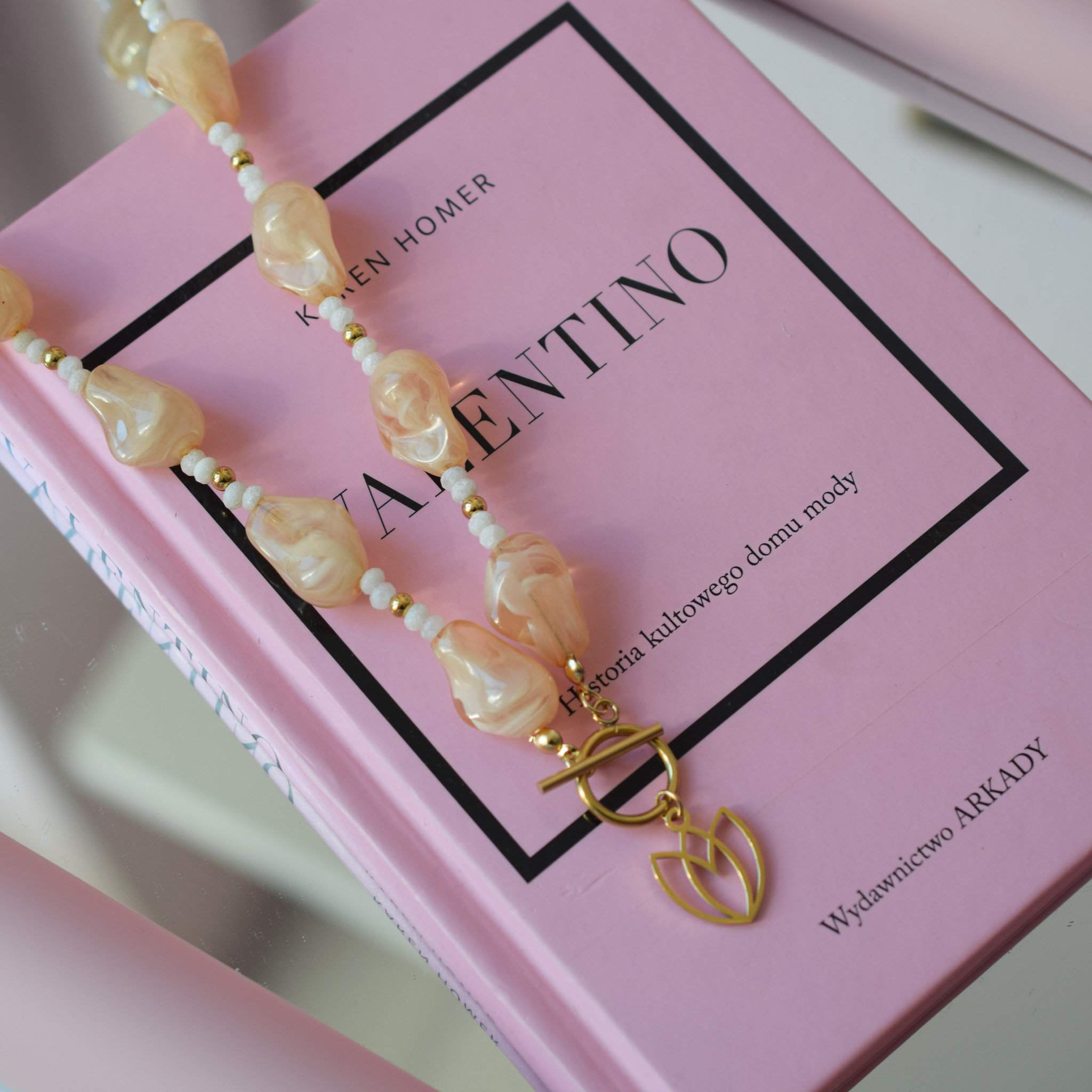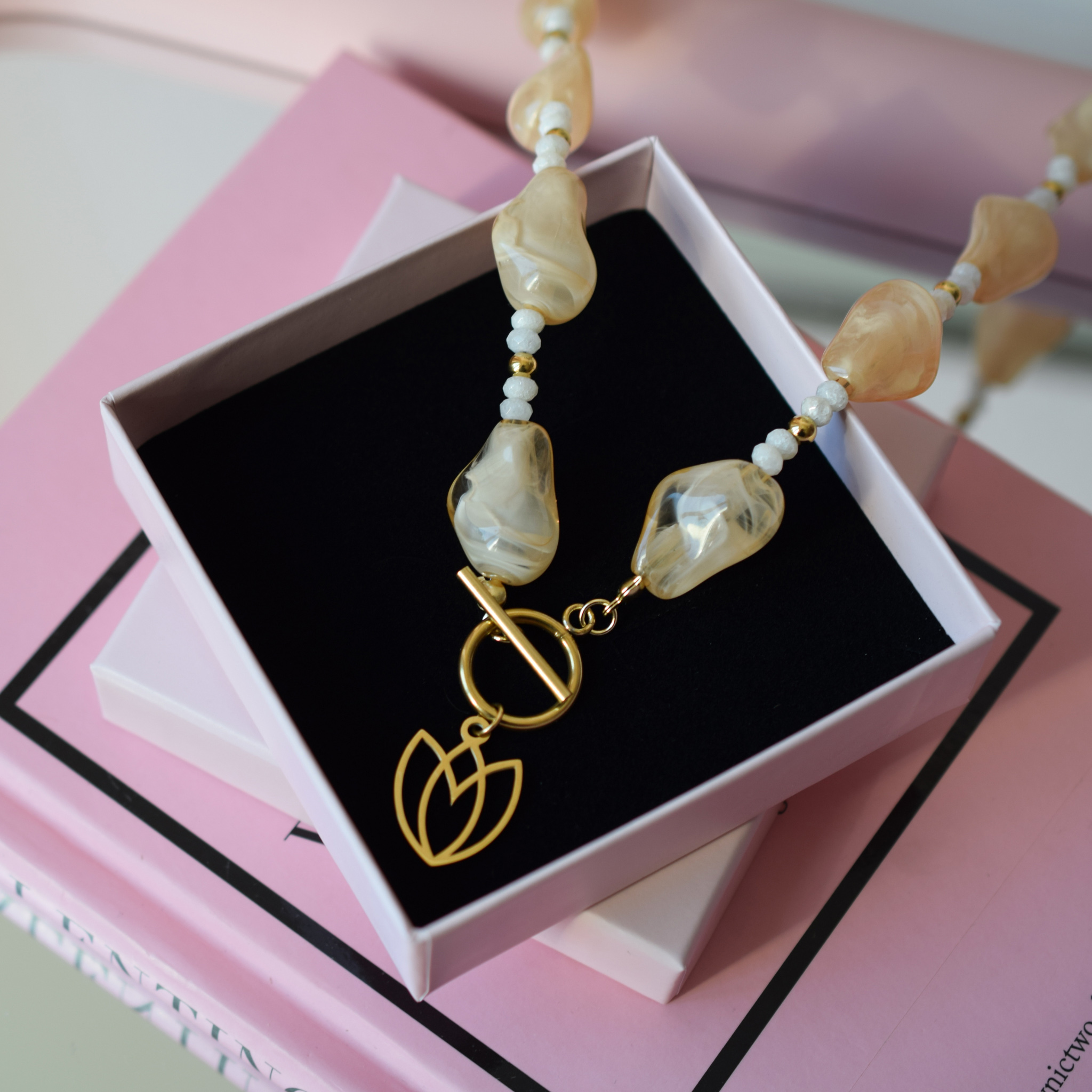 Wykonany z kamieni naturalnych, element贸w szlifowanej 偶ywicy jubilerskiej (resin) oraz stali szlachetnej poz艂acanej.聽