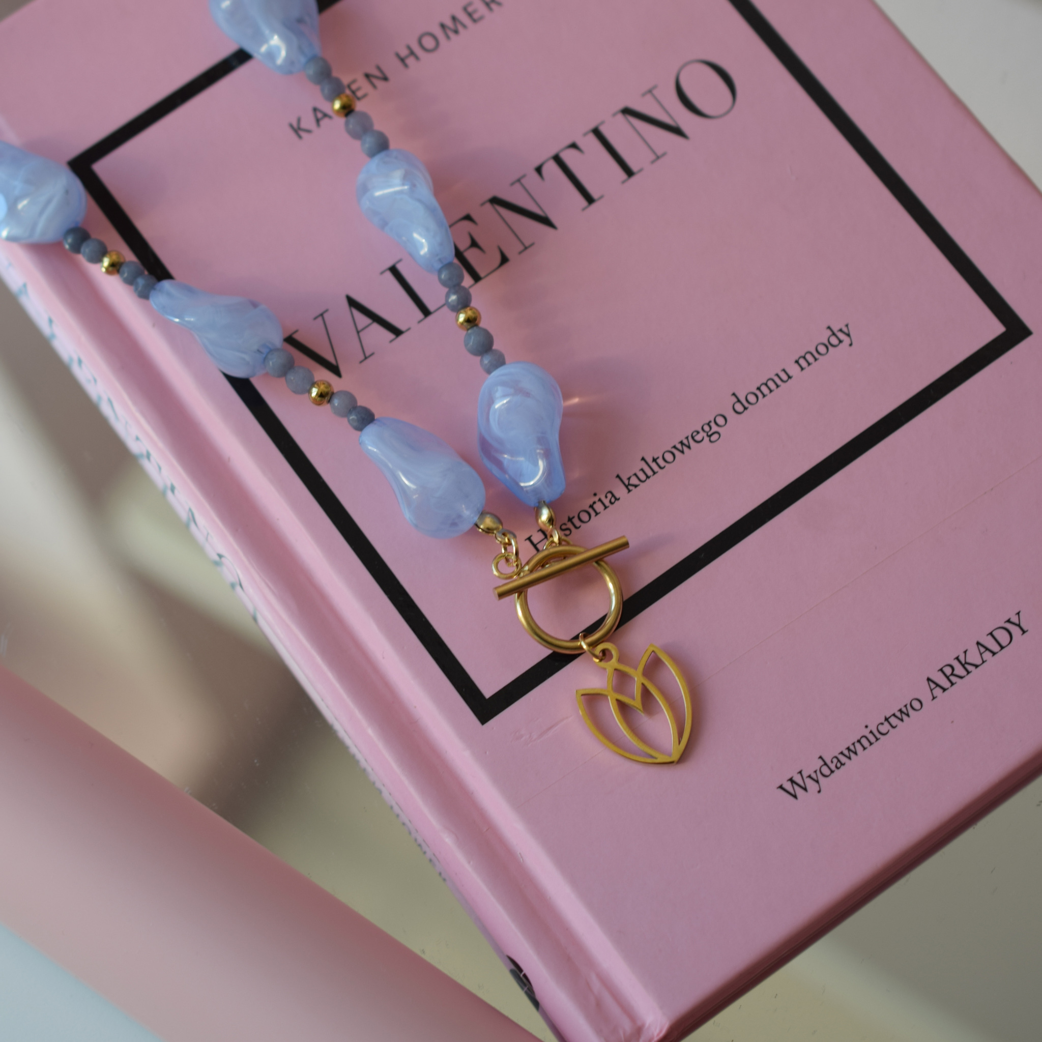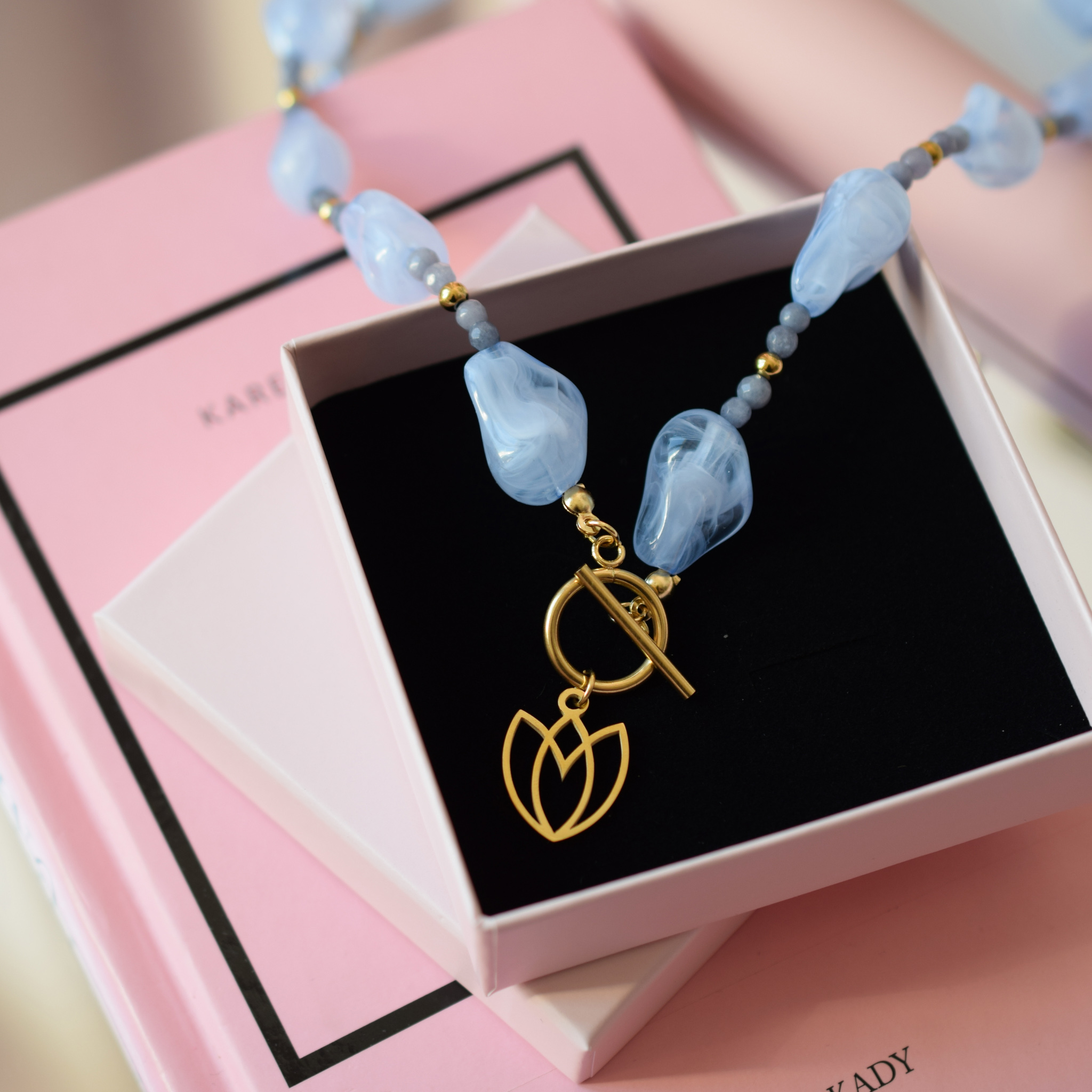 Wykonany z naturalnych kamieni, element贸w szlifowanej 偶ywicy jubilerskiej (resin) oraz stali szlachetnej poz艂acanej.聽