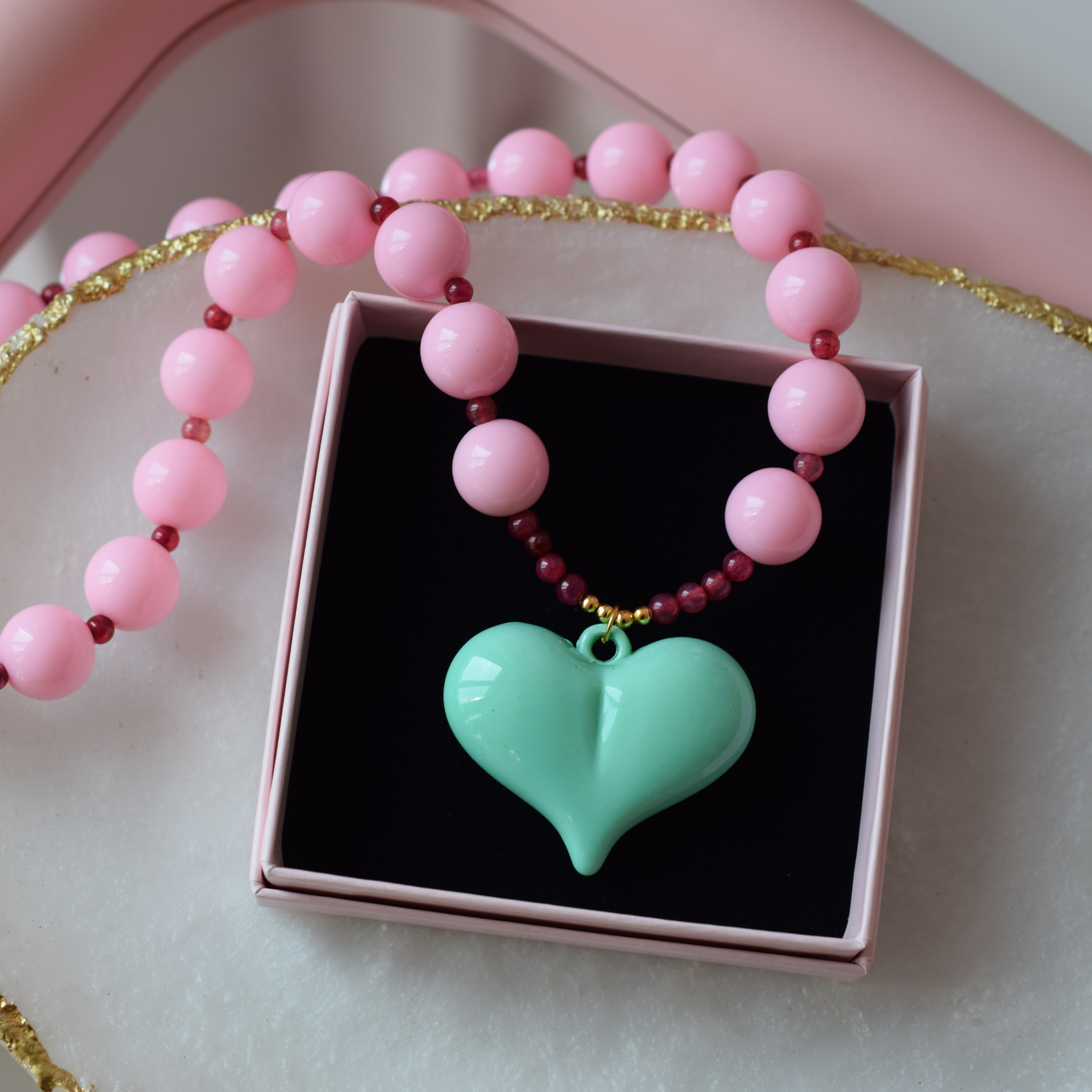 Wykonany z kamieni naturalnych - malinowego agatu, z艂otych kulek ze stali szlachetnej, poz艂acanej oraz du偶ych聽r贸偶owych kul z akrylu jubilerskiego.