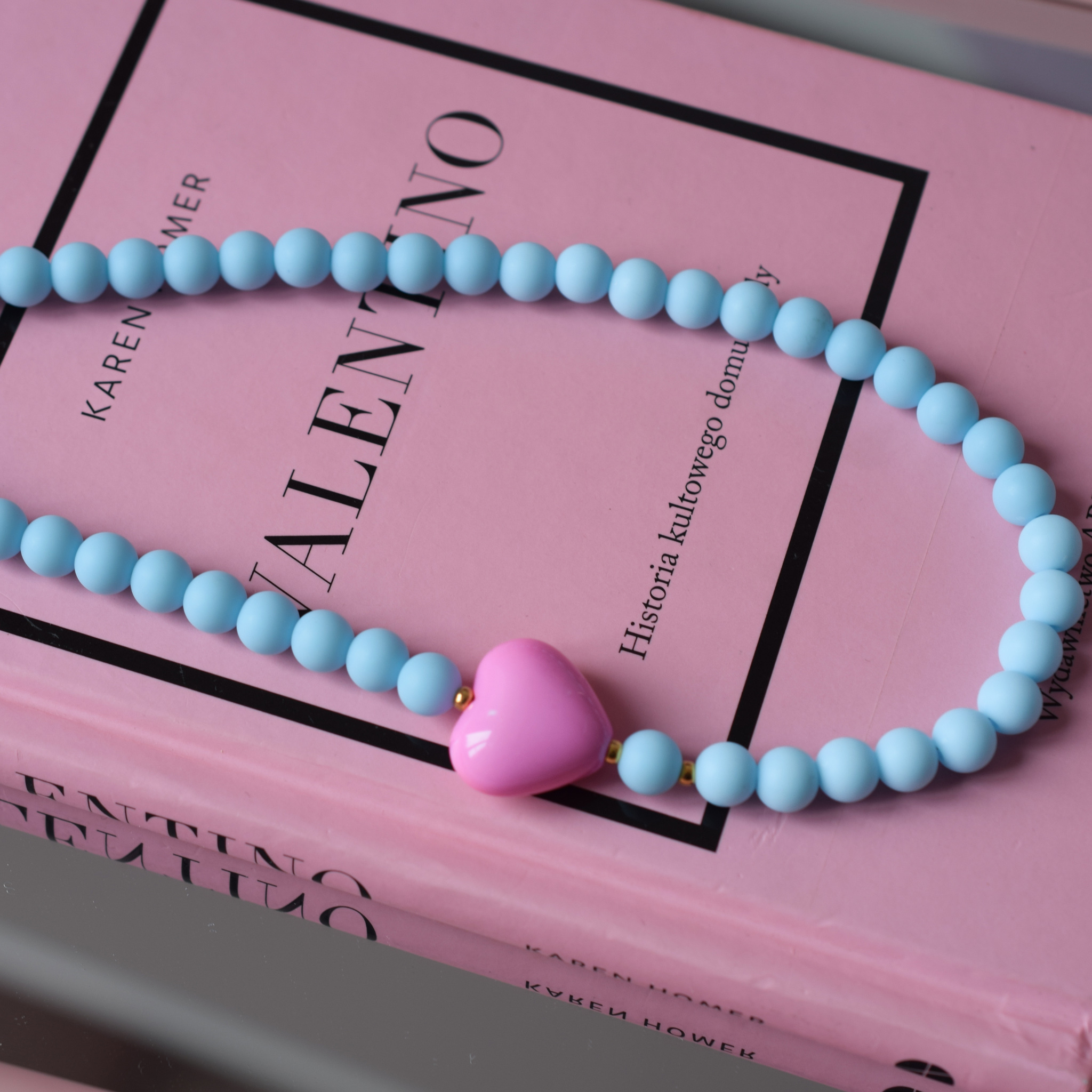 Pudrowo cukierkowa nowo艣膰 Croco D'oro. Naszyjnik w pi臋knym jasno niebieskim kolorze z akrylu jubilerskiego, zdobiony uroczym r贸偶owym sercem oraz kulkami ze stali szlachetnej, poz艂膮canej.