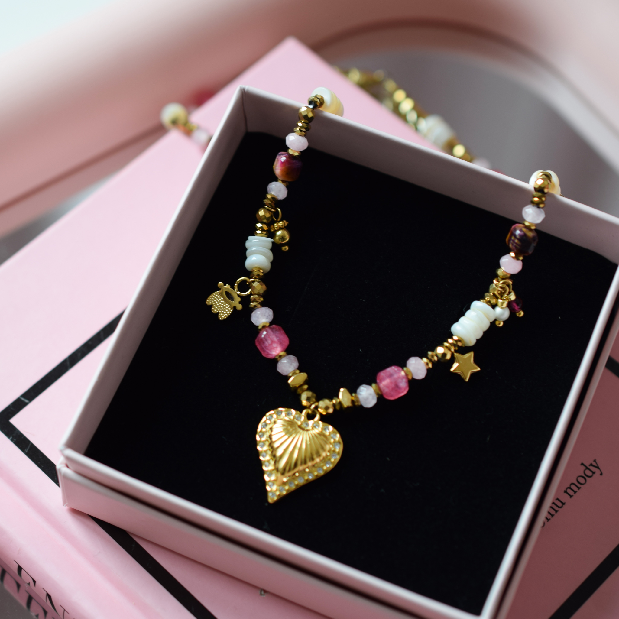 Wykonany z kamieni naturalnych oraz zawieszek ze stali szlachetnej, poz艂acanej. Zdobiony sercem.
