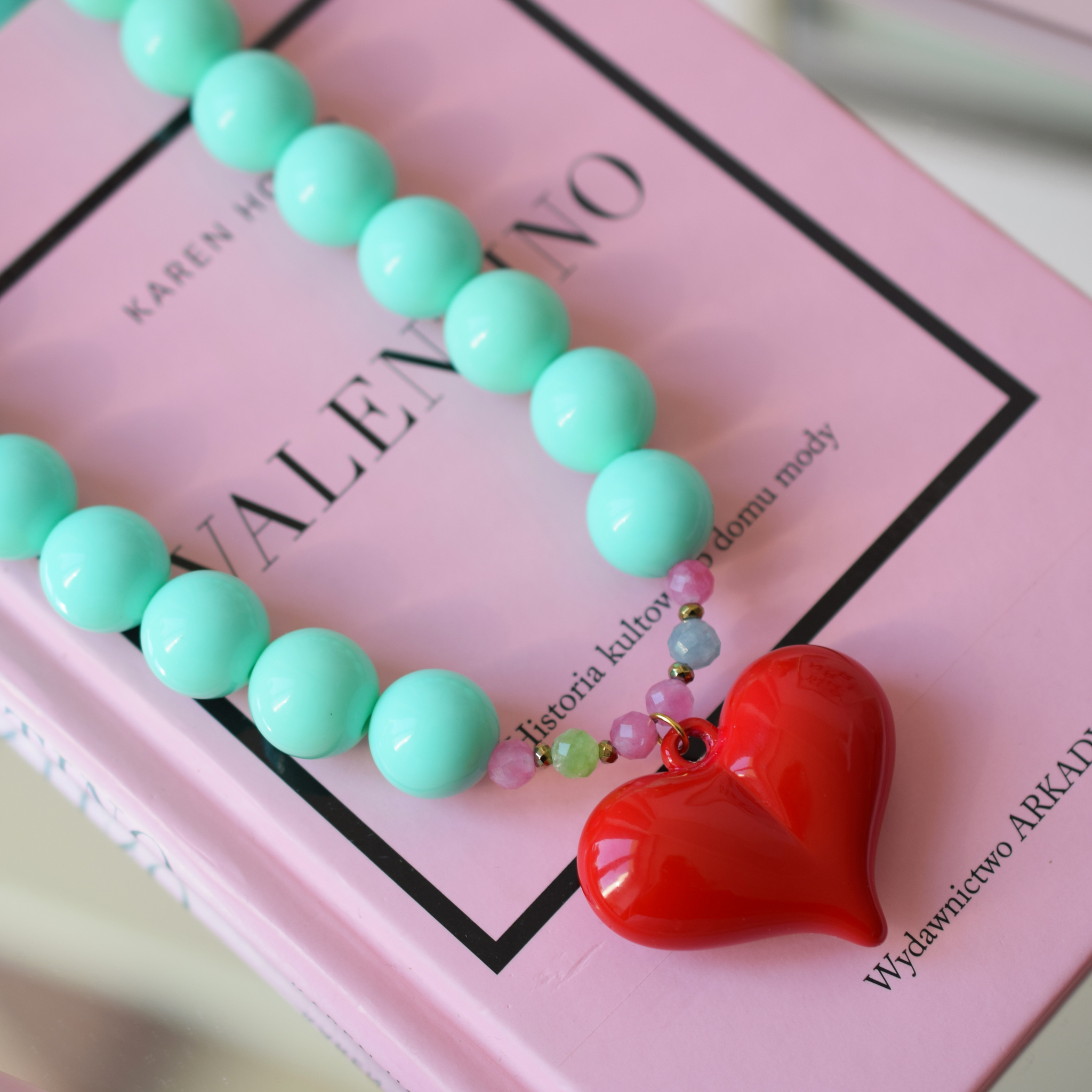 Wykonany z kamieni naturalnych - jadeitu turmalinowego, z艂otego hematytu oraz du偶ych zielonych kul z akrylu jubilerskiego.