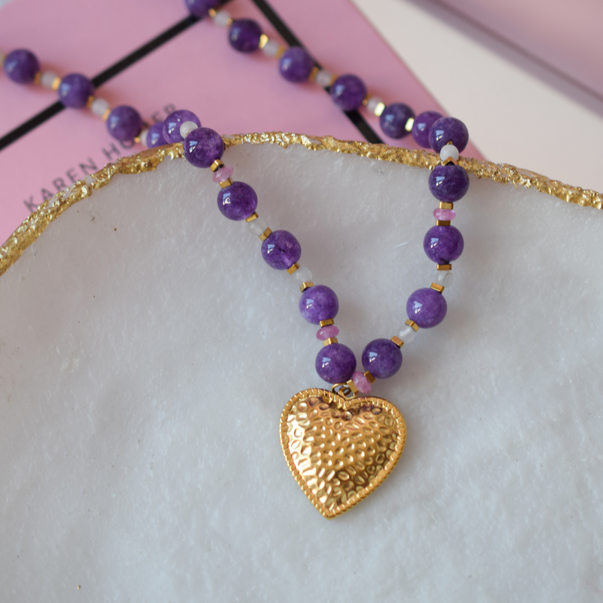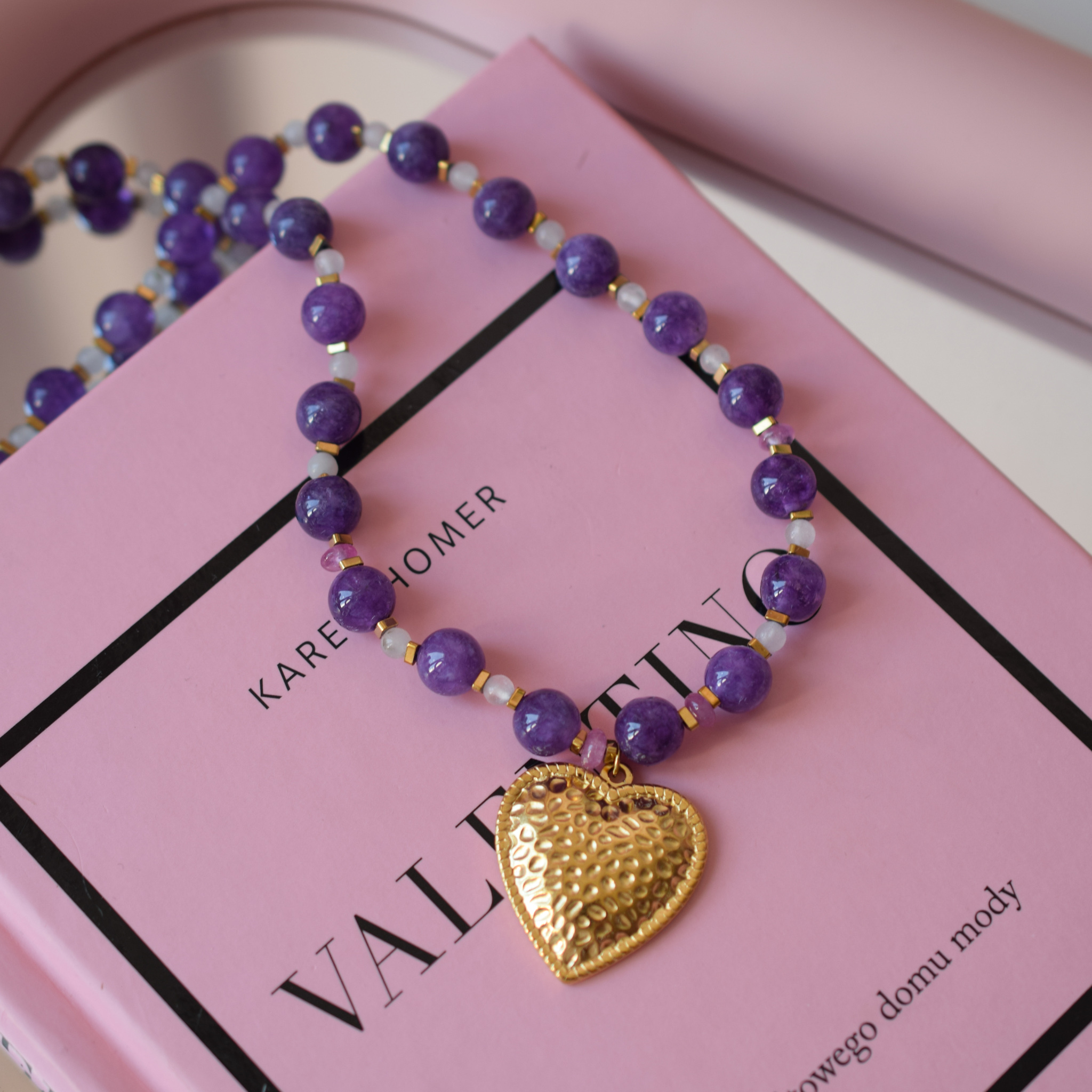 Wykonany z kamienia naturalnego - ametystu oraz kwarcu mlecznego. Zdobiony przepi臋kna zawieszk膮 sercem ze stali szlachetnej, poz艂acanej.